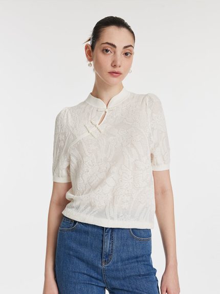 Iris Jacquard Sequins Mandarin Collared Women Knit Top $99.00 Original price was: $99.00.$50.00Current price is: $50.00.