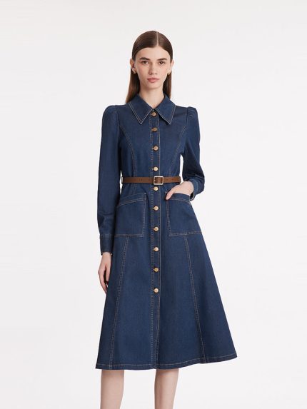Single-Breasted Lapel Women Midi Denim Dress With Belt $99.00