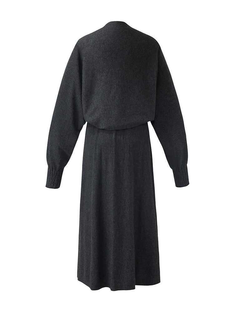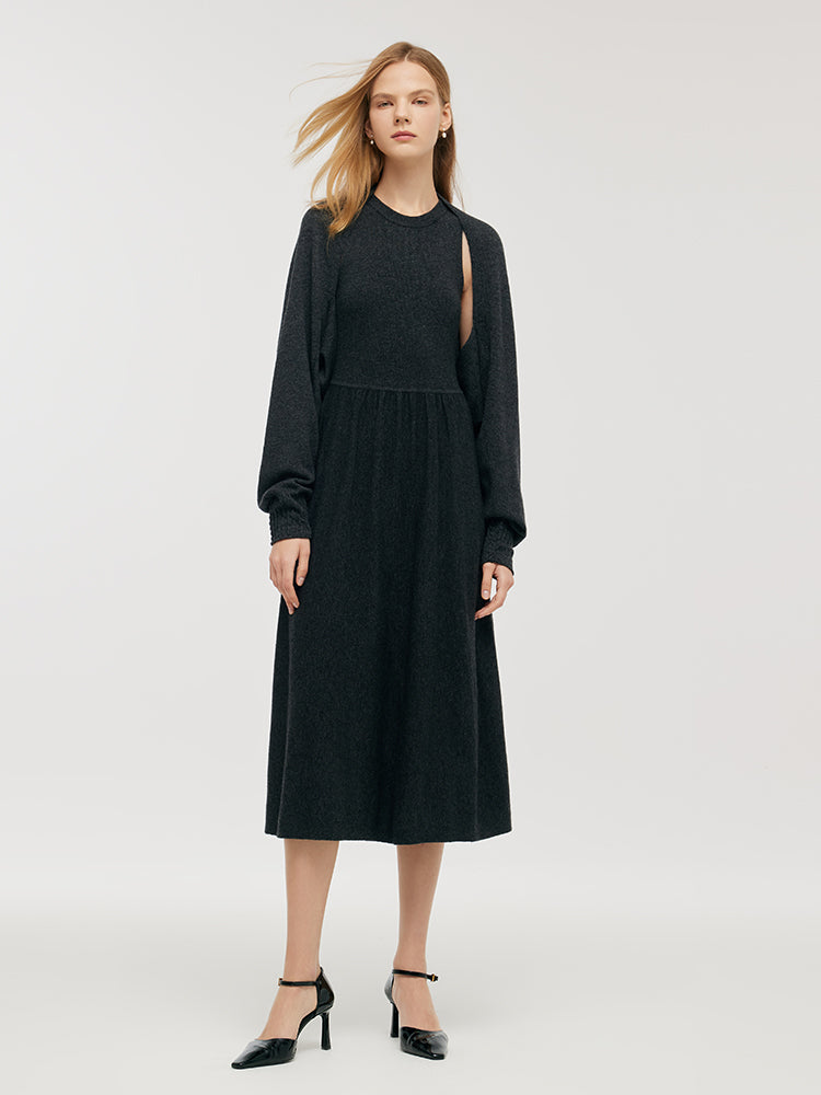 This two-piece set is made from a blend of thermoregulating fibers, superfine wool, and nylon, ensuring warmth and comfort. The outer piece can be worn as a jacket or a scarf, offering simplicity and practicality. In early autumn, you can wear the slip dress alone; in late autumn, it works as a set, and in winter, it can be paired with a coat. Overall, this set will be a very practical addition to your wardrobe.
